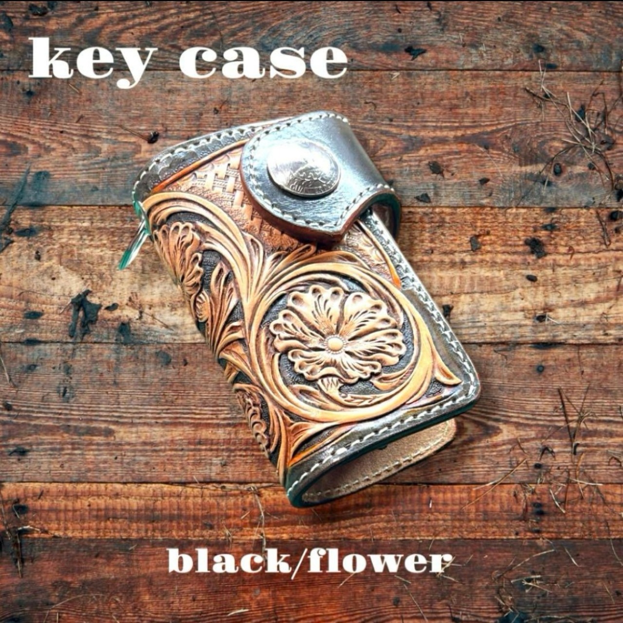 サドルレザーにフラワーと蔦のカービングを施して製作したFivesオリジナルのキーケースのブラックverになります。