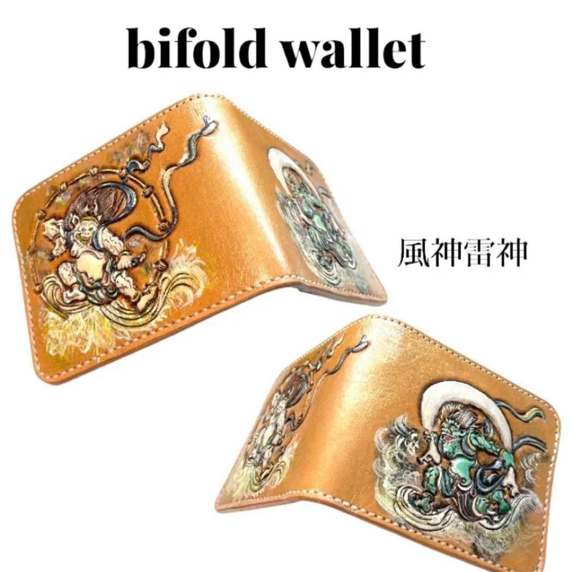 ハーマンオーク社のツーリングレザーに細かな風神と雷神をカービングして繊細なカラーリングを施したハンドメイドのコインケースです。
