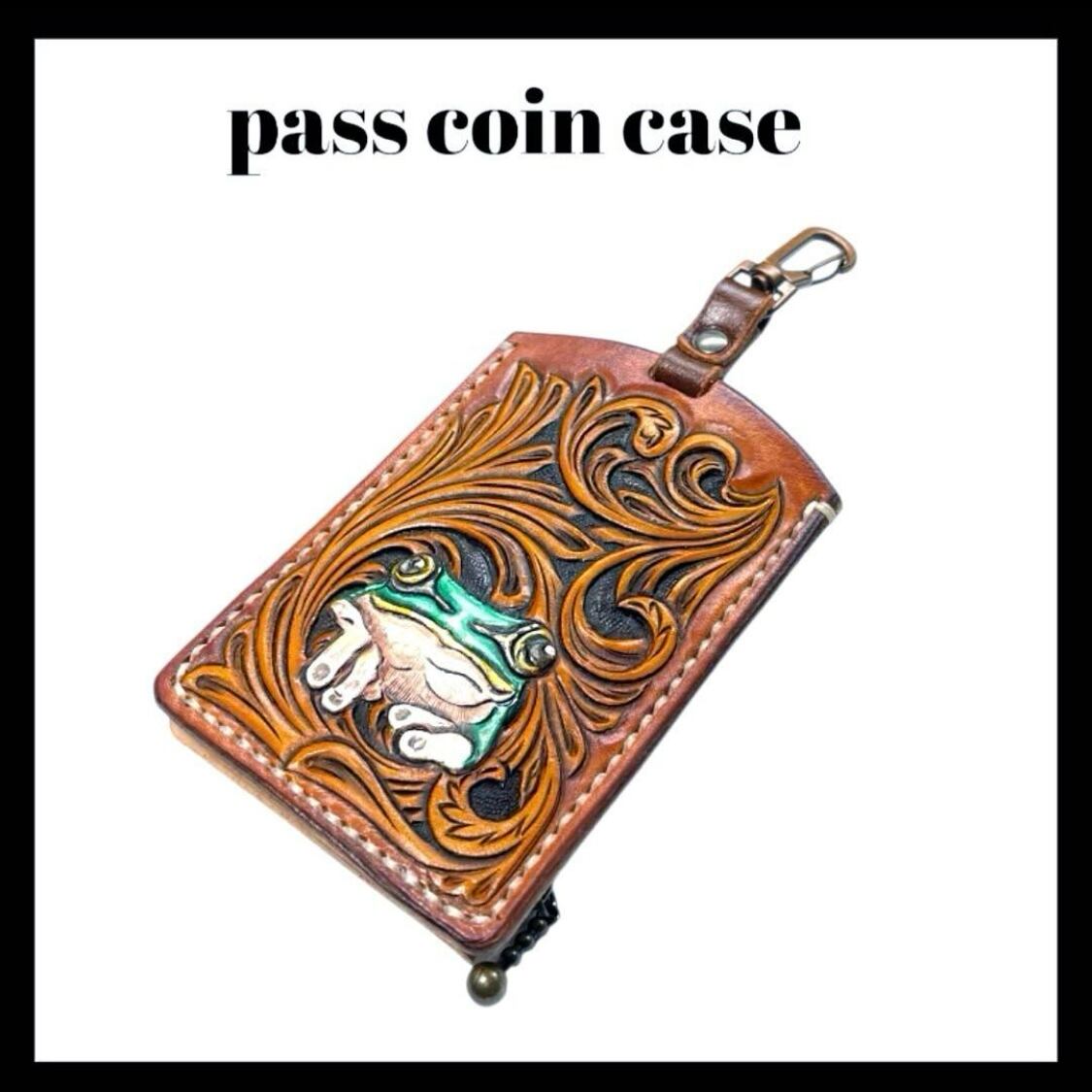 ツーリングレザーにカエルをメインに蔦を周囲にカービングし製作したFivesオリジナルのパスコインケースです。