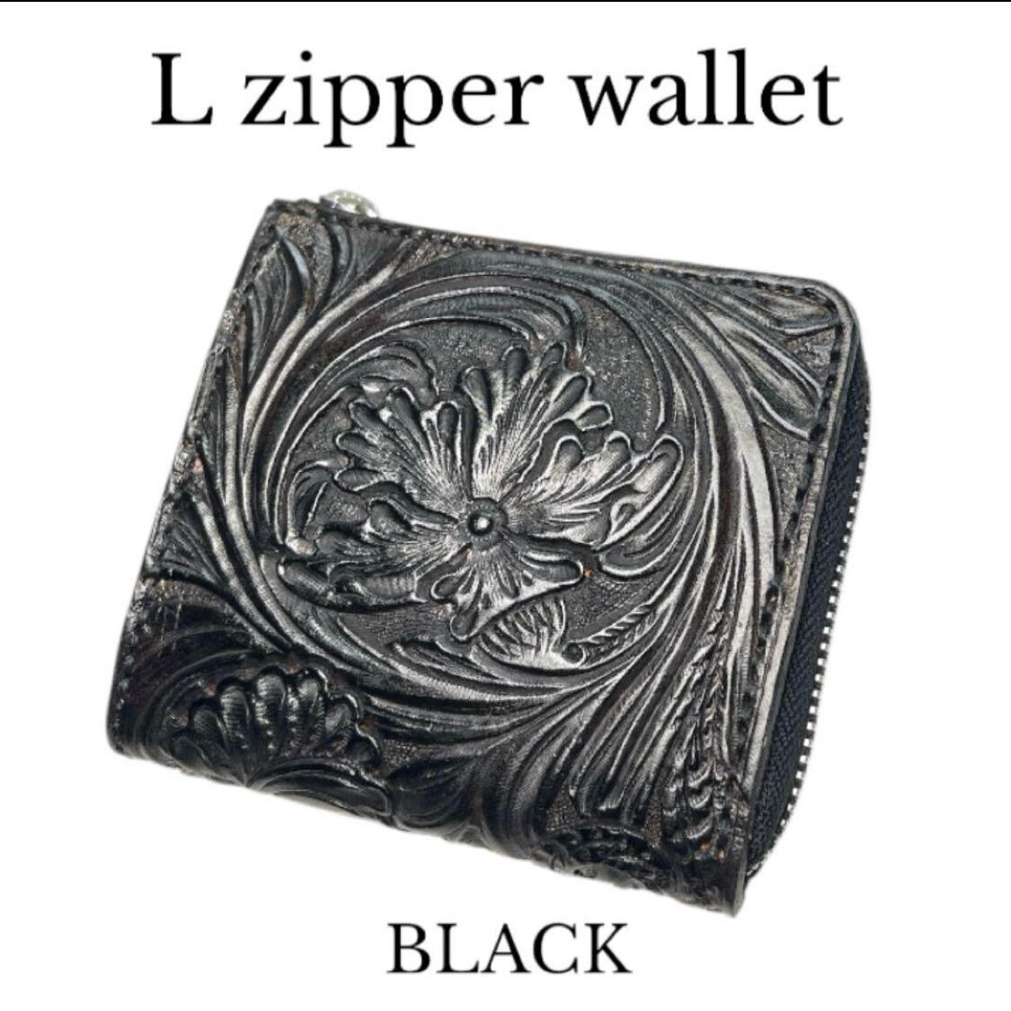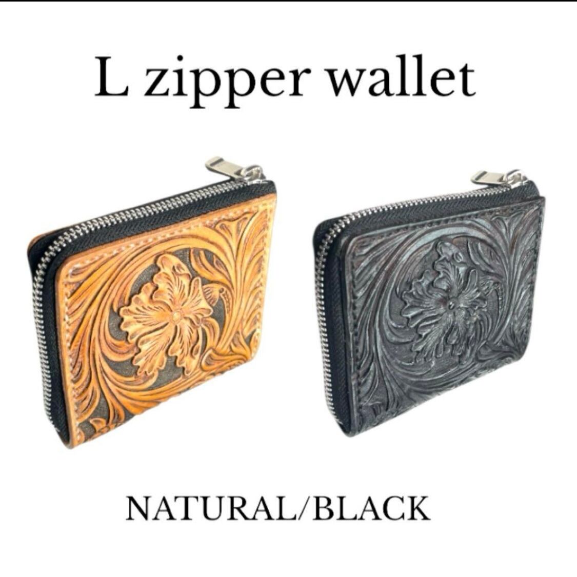ハーマンオーク社のツーリングレザーにフラワーと蔦のカービングし黒染めして製作したオリジナルのLファスナーウォレットです。