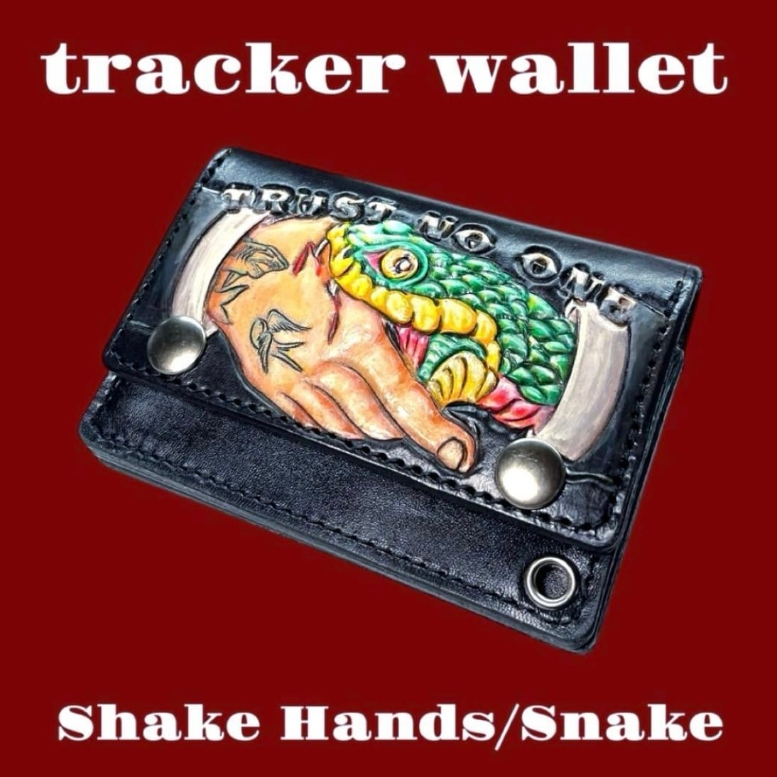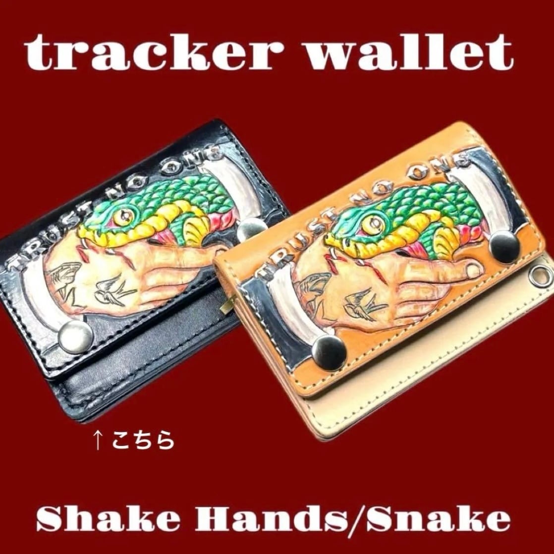 ツーリングレザーにオールドスクールのデザインでスネークのシェイクハンドカービングし黒に染色したコンパクトサイズのトラッカーウォレットです。