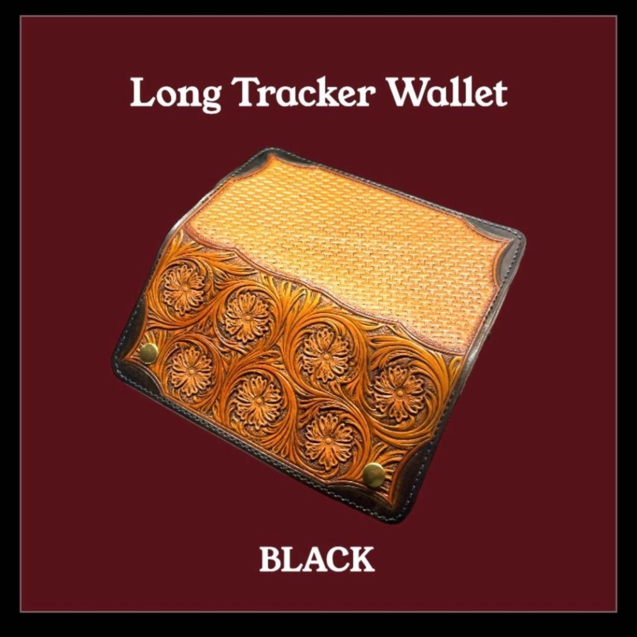 ハーマンオーク社のツーリングレザーにフラワーと蔦、背面にバスケット柄をカービングし縁とインナーを黒で手染めした丘染め仕様。