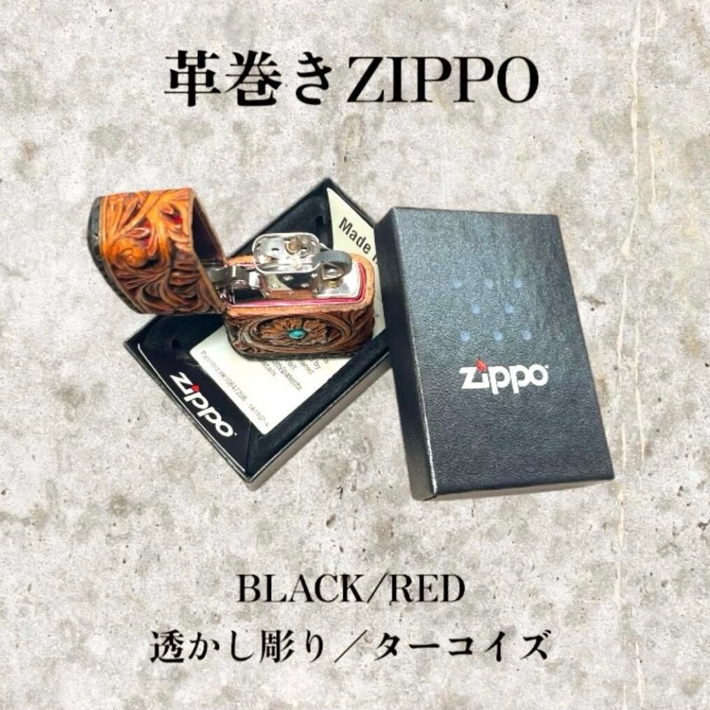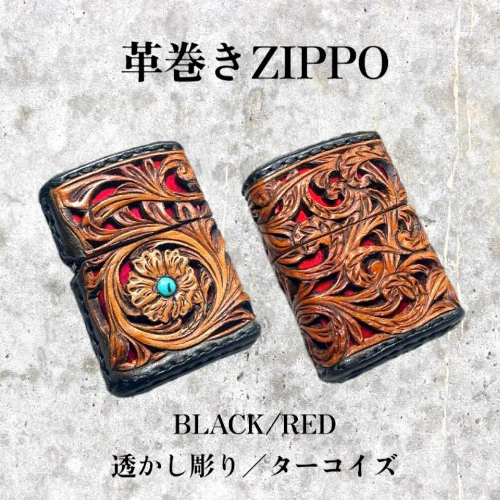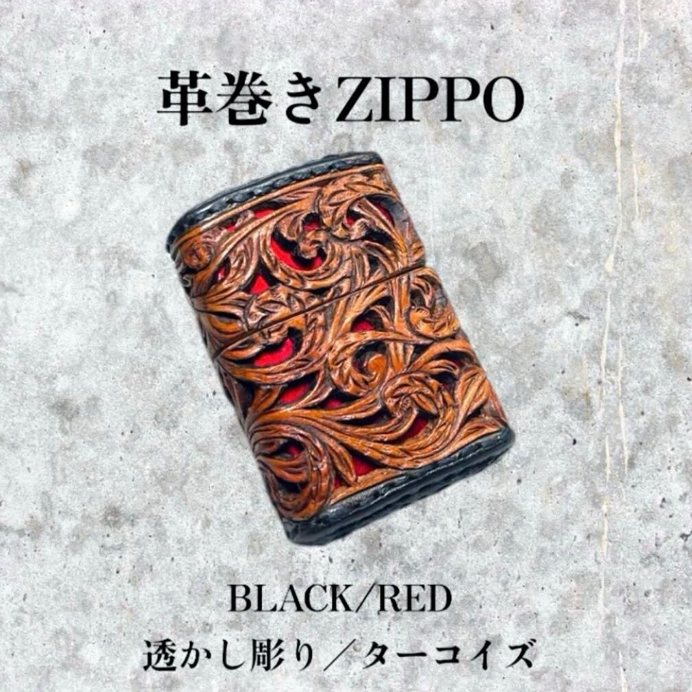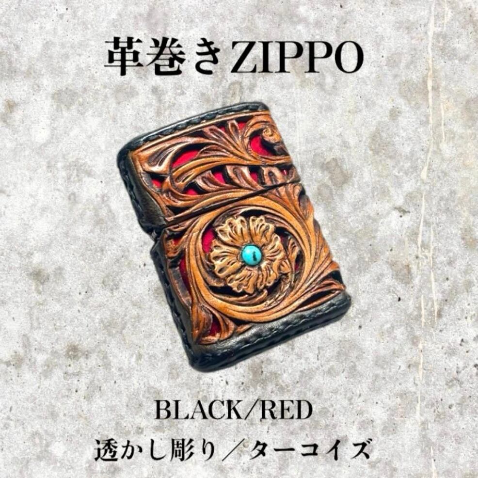 レザーカービング 革巻きzippo BLACK•RED/フラワー 透かし彫り/ターコイズ