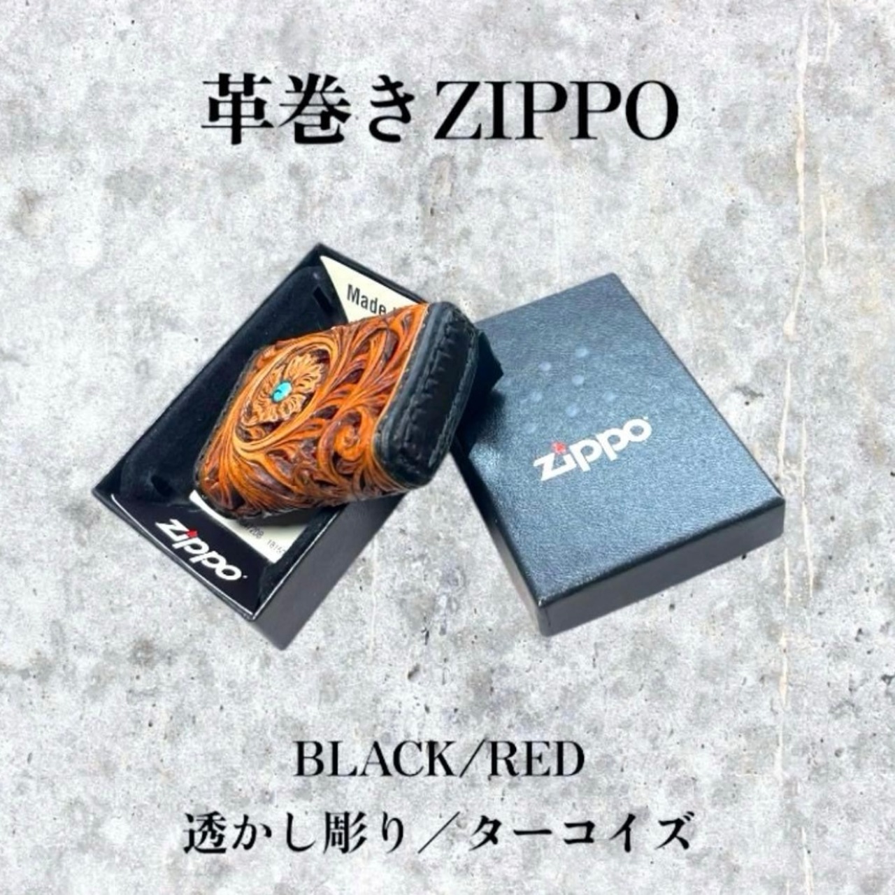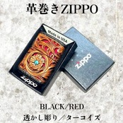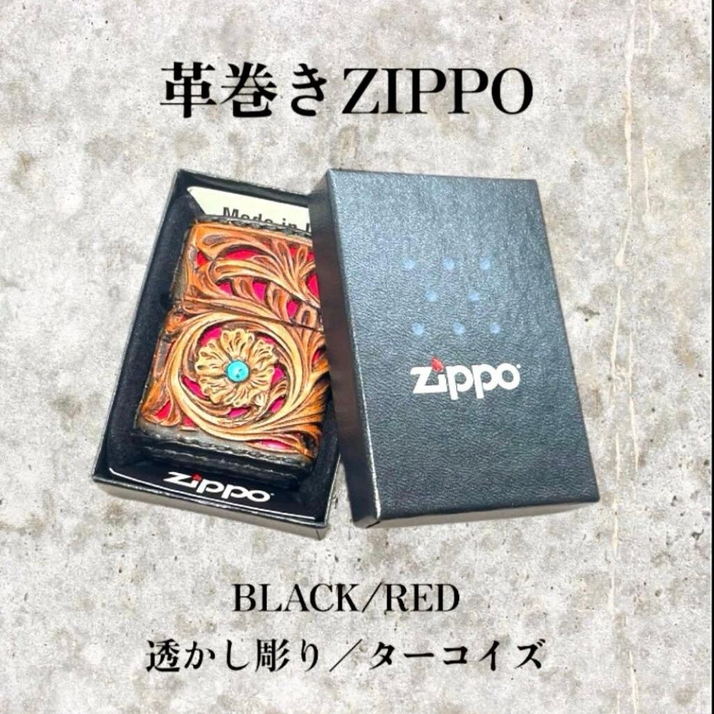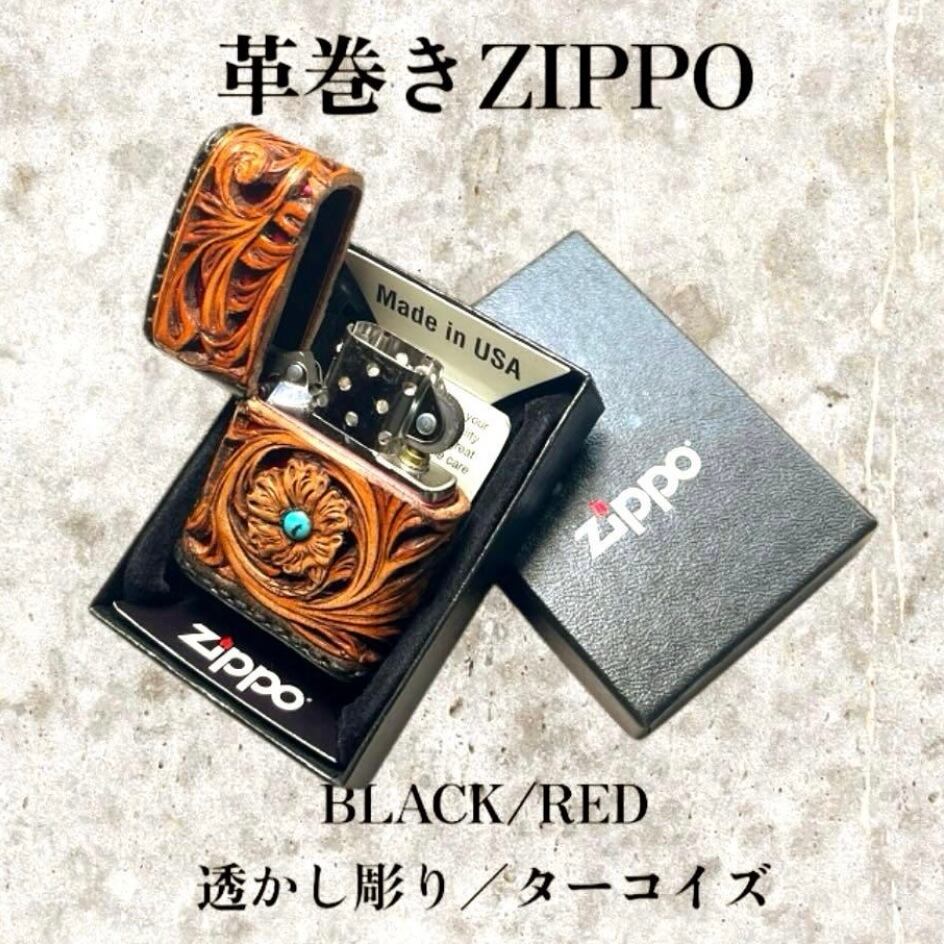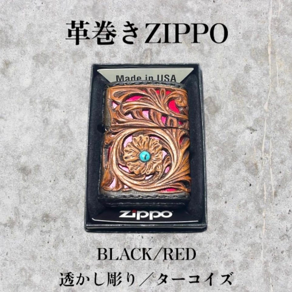 レザーカービング 革巻きzippo BLACK•RED/フラワー 透かし彫り/ターコイズ