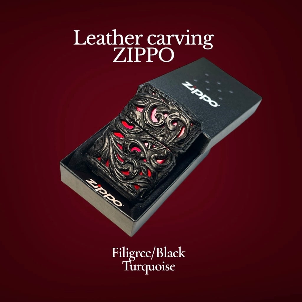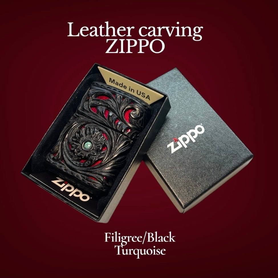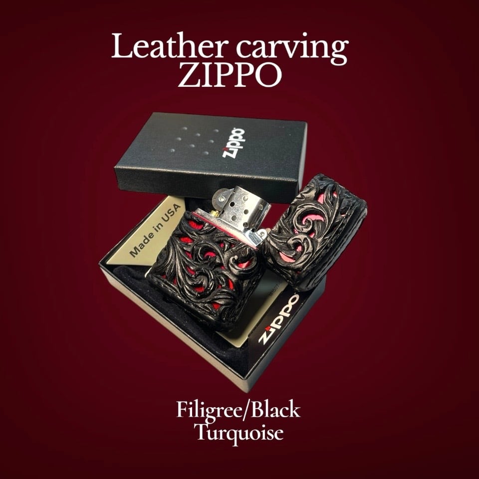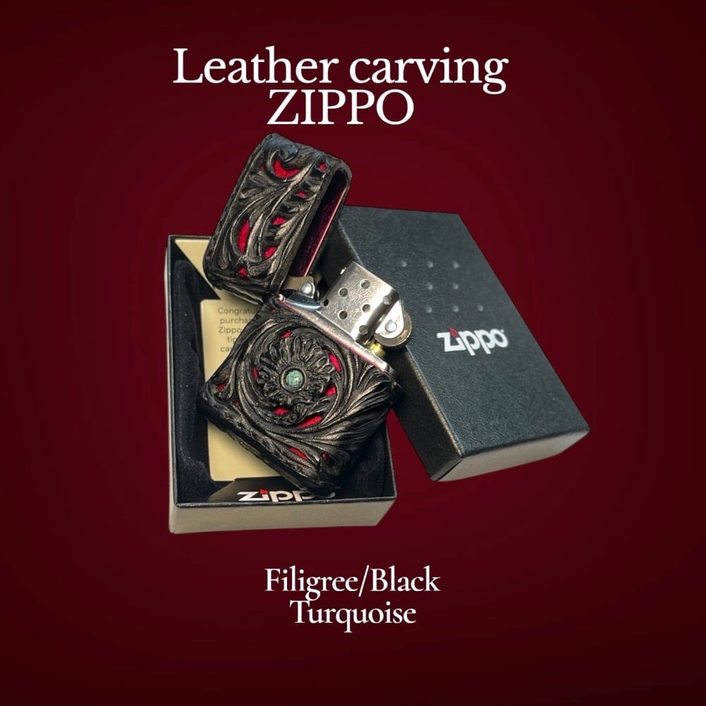 レザーカービング 革巻きzippo BLACK•RED/透かし彫り/ターコイズ